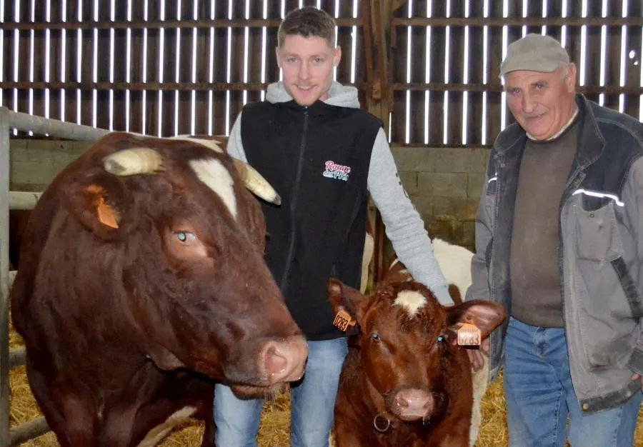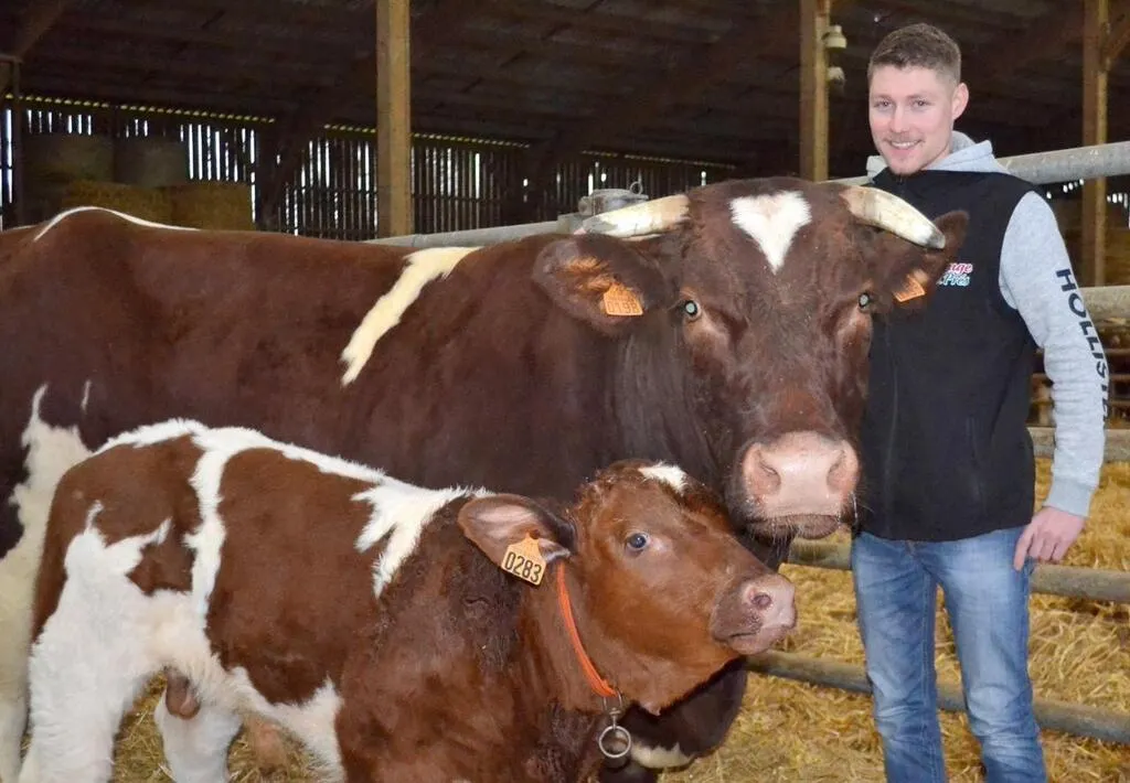 Opaline et son veau Ultime, avec Maxence Patureau. La vache a remporté le 1er prix dans la catégorie femelles adultes. © Le Maine Libre