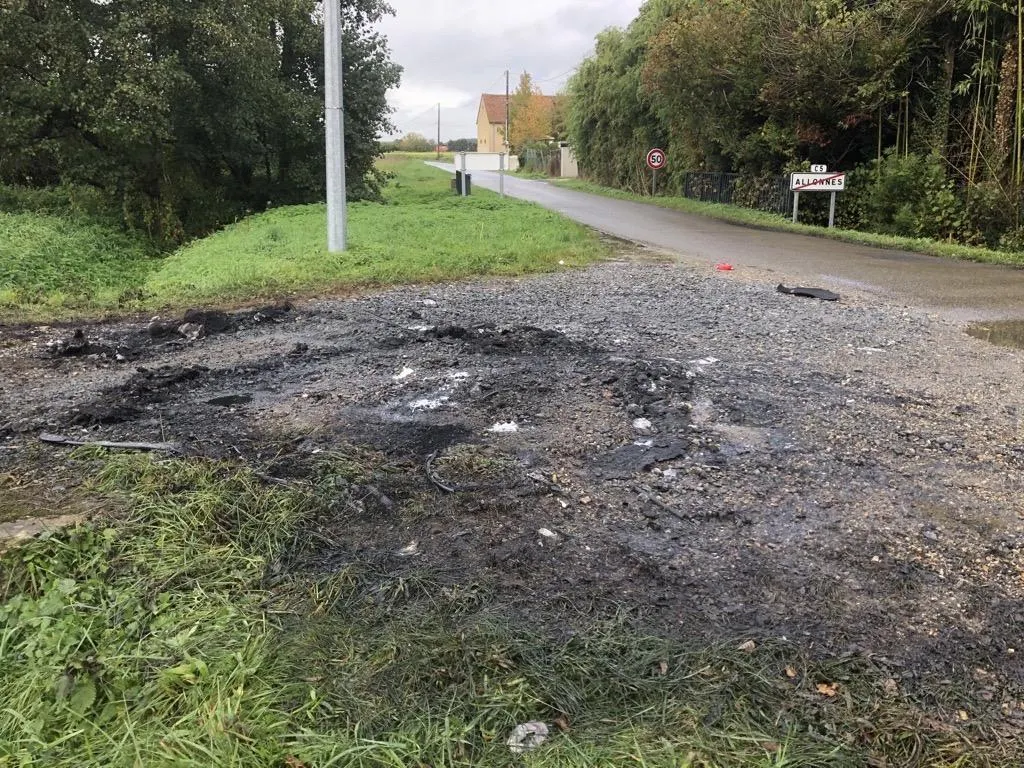 Une voiture a brûlé à proximité du Vieux-Bourg d’Allonnes dans la nuit du dimanche 29 octobre au lundi 30 octobre 2023. La nuit d’avant, deux véhicules ont été volés dans d’autres secteurs autour du Mans, avant d’être incendiés. ? © Le Maine Libre