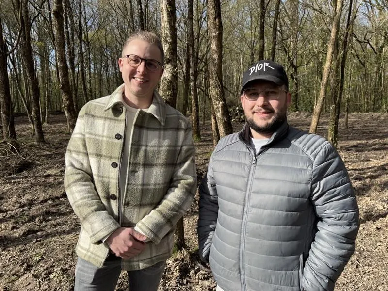 Maximilien Michel et Steven Da Silva sur le futur terrain de paintball de La Chapelle-d’Aligné, près de La Flèche (Sarthe), qui doit ouvrir le samedi 23 mai 2026. © Ouest-France
