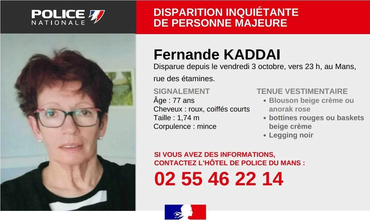 Fernande Kaddai est portée disparue au Mans depuis ce vendredi 3 octobre 2025. Elle a été vue pour la dernière fois rue des Étamines, dans le quartier de la Madeleine au nord du Mans, tard dans la soirée aux alentours de 23 heures. La police de la Sarthe lance un appel à témoins pour disparition inquiétante de personne majeure sur ses réseaux sociaux.