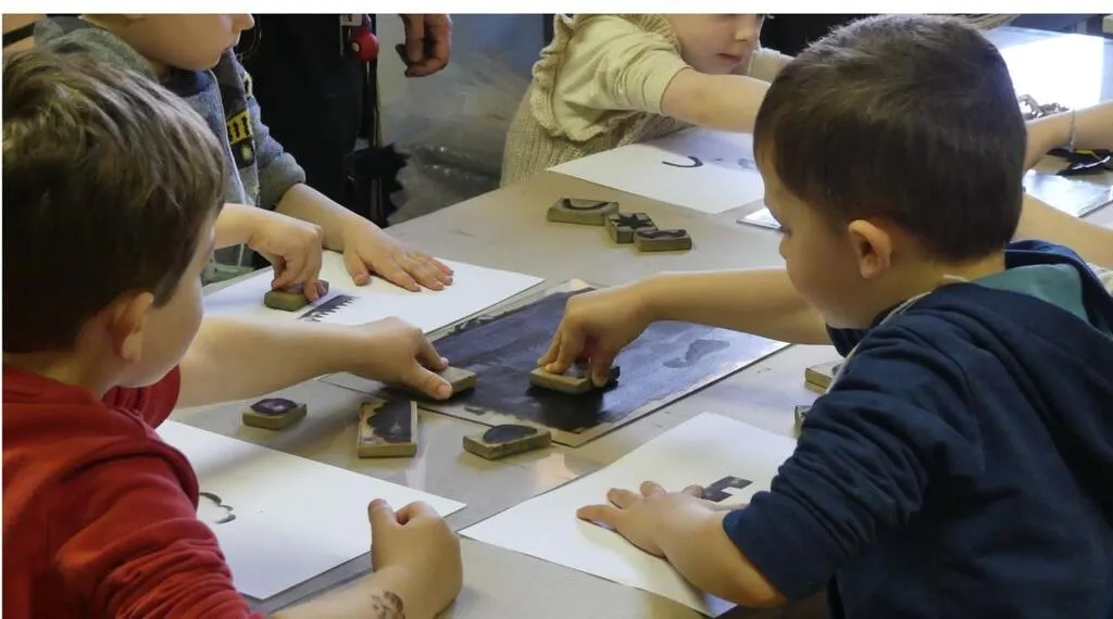 Grâce à la présence de l’artiste Roxane Verquin, un atelier s’est installé invitant les élèves jusqu’en CE1 à exercer leur talent artistique. À l’aide de tampons encreurs, ils ont découvert une technique prisée par l’artiste, la collagraphie qui mêle collage et écriture.