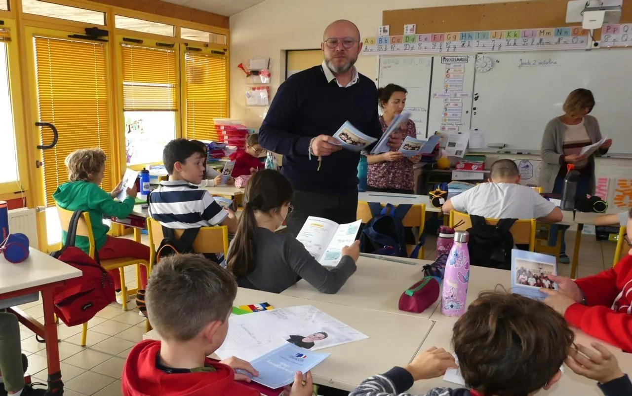Benjamin Laburthe-Tolra a remis les livrets aux écoliers. © Le Maine Libre