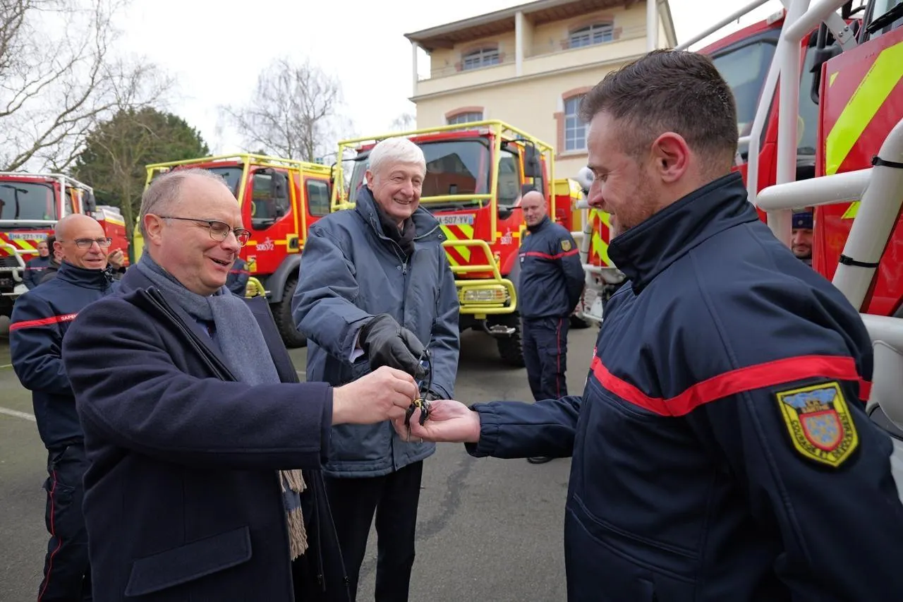 L’ancien préfet Emmanuel Aubry et le président du Département Dominique Le Mèner lors d’une remise de clés de six nouveaux camions en janvier dernier. © Ouest-France