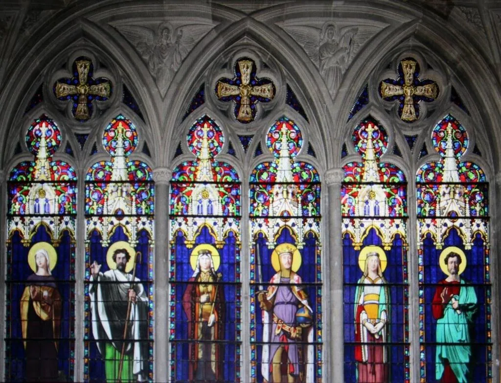 Deux rangées de six saints se font face, dans la galerie proche du chÅ“ur de la chapelle royale Saint-Louis de Dreux (Eure-et-Loir). © Association Vitraux Fialeix