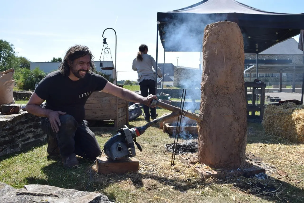 Charles Torres, forgeron-métallurgiste breton diplômé en archéologie, à côté d’un bas fourneau qu’il a construit en compagnie de Simon Pellequer. Ouest-France