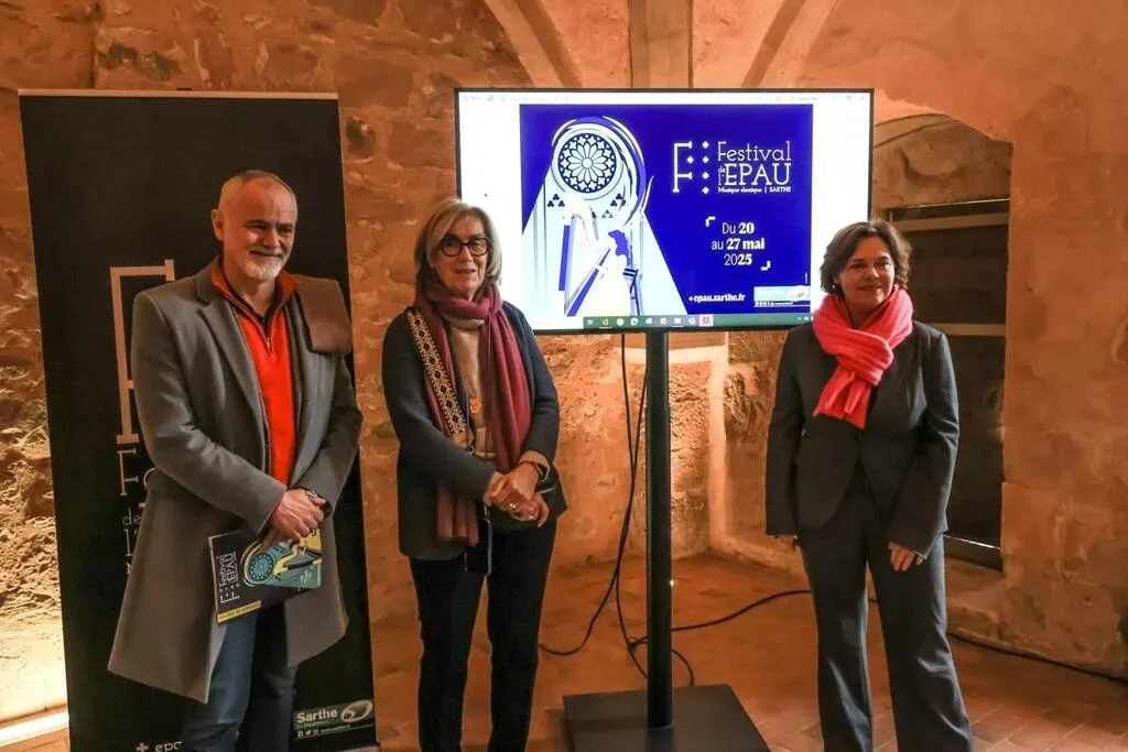 De gauche à droite, Renaud-Juan Vasseur, directeur de la culture au Département, Véronique Rivron, première vice-présidente du Département, notamment en charge de la Culture et Marianne Gaussiat, programmatrice du festival, lors de sa présentation, mardi 4 février, à l’abbaye de l’Épau. © Ouest-France