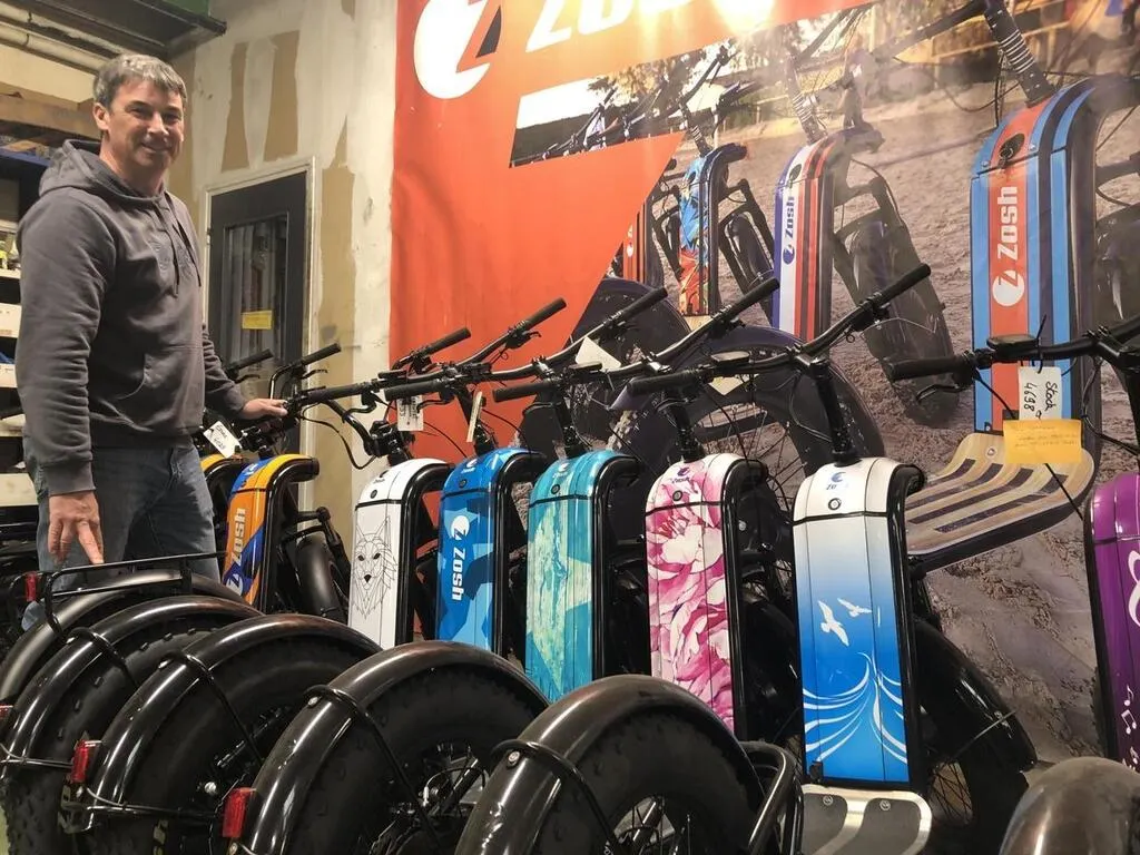 Ludovic Cochet, PDG de l’entreprise, dans ses vastes locaux de 12 000 m2 à Sougé-le-Ganelon. Ici dans le showroom avec sa trottinette tout-terrain, conçue et fabriquée à l’usine. Il en produit un millier par an. © Ouest-France