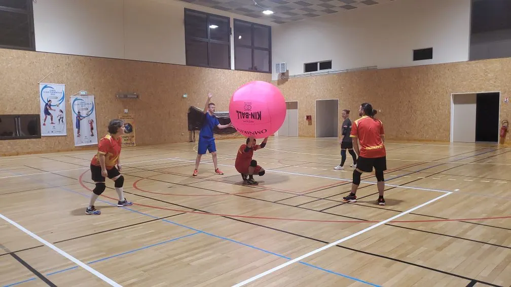 Avec son ballon de 1,22 mètre de diamètre, le kin-ball est l’un des sports collectifs les plus spectaculaires. Créé au Québec en 1986, le kin-ball se distingue par son ballon géant de 1,22 mètre de diamètre et un principe unique : trois équipes s’affrontent simultanément sur un terrain carré, sans but ni panier. L’équipe en possession du ballon attaque une autre équipe en l’appelant par sa couleur, qui doit rattraper la balle avant qu’elle ne touche le sol. Ce jeu rapide, stratégique et très collectif se joue en manches de 13 points, sans limite de temps, favorisant le suspense et l’intensité.