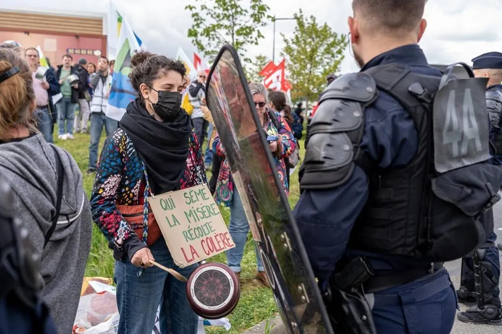 Coulaines, lundi 24 avril 2023. Devant la structure d’accompagnement à la sortie, le ministre de la justice, Éric Dupond-Moretti, échange avec Vincent Le Dimeet, secrétaire local du Snepap-FSU, le principal syndicat du personnel pénitentiaire au sein des Croisettes. © Photo Le Maine Libre - Xavier SARRAT.