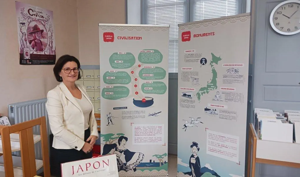 Isabelle Tixier Tollemer, responsable de la bibliothèque, présente deux des panneaux sur le Japon. © Ouest-France