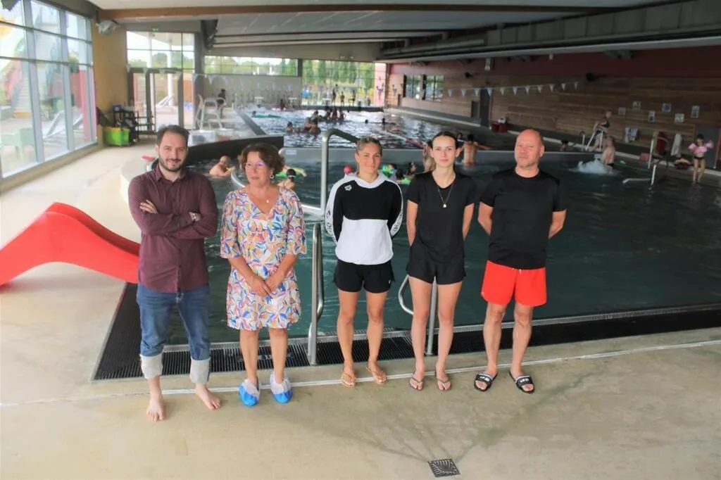 De gauche à droite : Dylan Amar, directeur des Bains d’Orée, Nathalie Dupont, présidente de la communauté de communes, Marie Estéban, championne de France de natation 50 m nage libre, Ambre Gaugain, maître-nageuse sauveteuse, et David Poirrier, maître-nageur. © Ouest-France