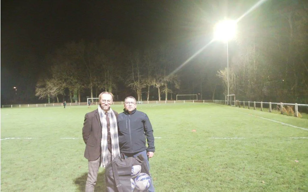 Stéphane Gérault, maire adjoint en charge du sport, et Ludovic Delmotte, coprésident du FC Écommoy, ont constaté le bon fonctionnement de l’éclairage. © Ouest-France.