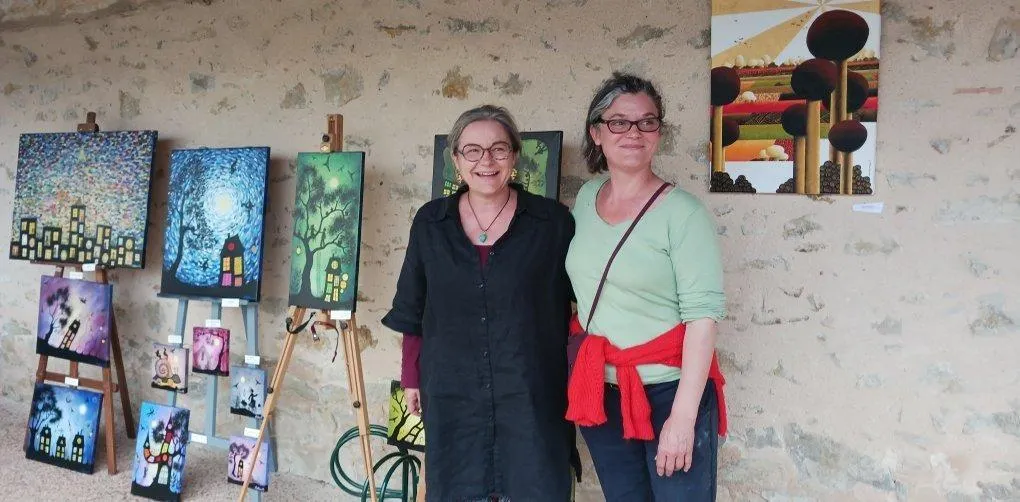 La cour de la bibliothèque accueillait, samedi, une exposition organisée par Isabelle Tollemer Tixier, responsable de la bibliothèque municipale. Nathalie Travaillard (à droite), une Écomméenne, a présenté certaines de ses Å“uvres. « Mon inspiration, c’est la nature. C’est surtout l’arbre qui est cÅ“ur des paysages » explique-t-elle. La deuxième artiste présentait des toiles dans un univers totalement différent. « J’invente des paysages nocturnes et des mondes improbables », lance Adeline M (à gauche), artiste originaire du Mans. © Ouest-France