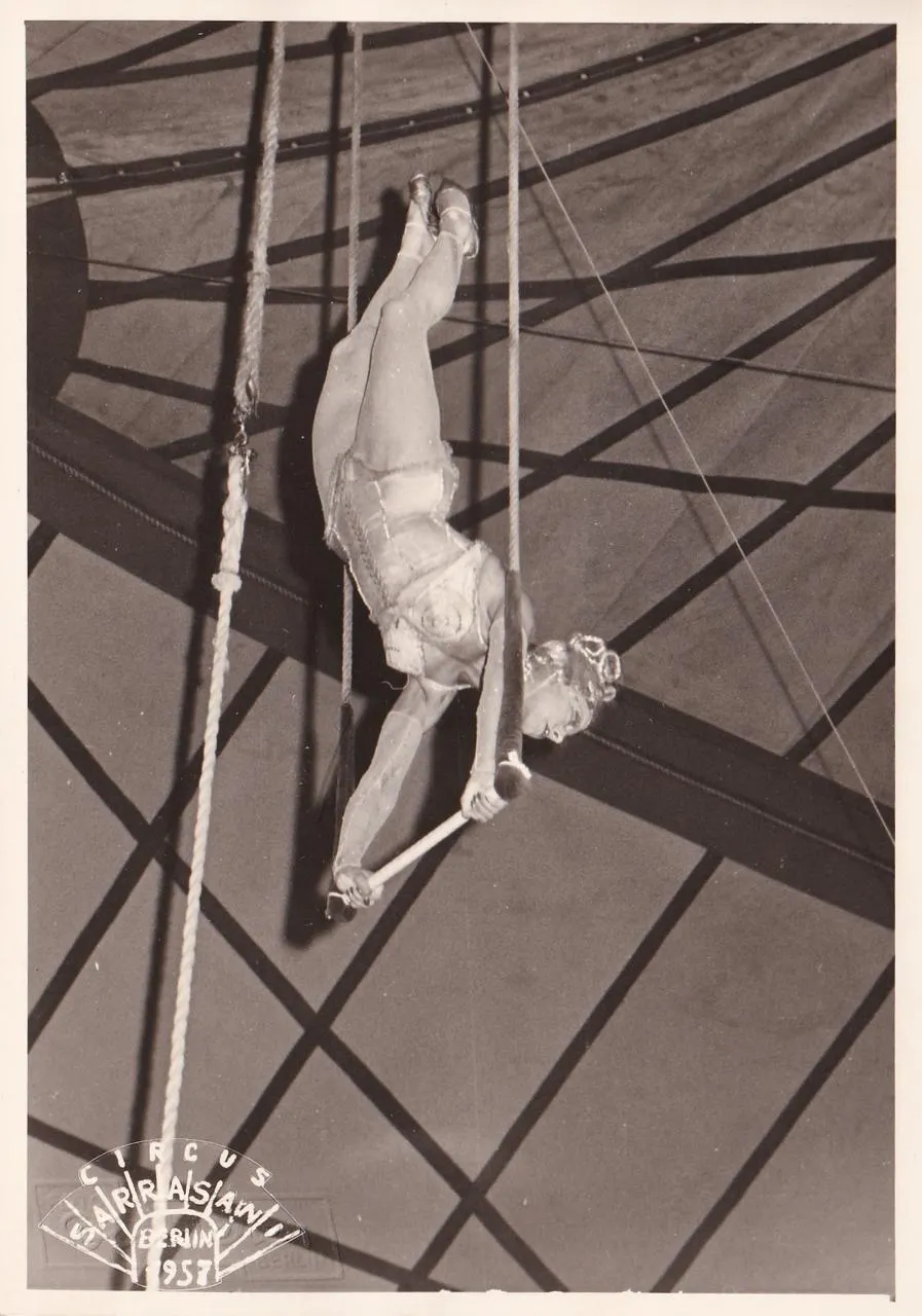 Else Jaekel a commencé le trapèze à presque 40 ans. Sa quatrième chute, au Festival international du cirque d’Alger en 1958, mettra fin à sa carrière. © Collection Denis Granai/ Tonderer