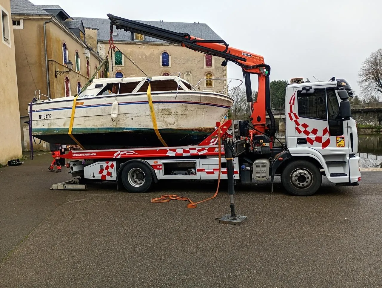 Le bateau est reparti sur le plateau de la dépanneuse du garage Fontaine. © Ouest-France