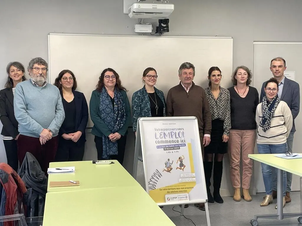 Les acteurs de la journée parcours emploi réunis autour de la sous-préfète de La Flèche, Marie-Élize Tilly, au centre, derrière la pancarte. © Ouest-France