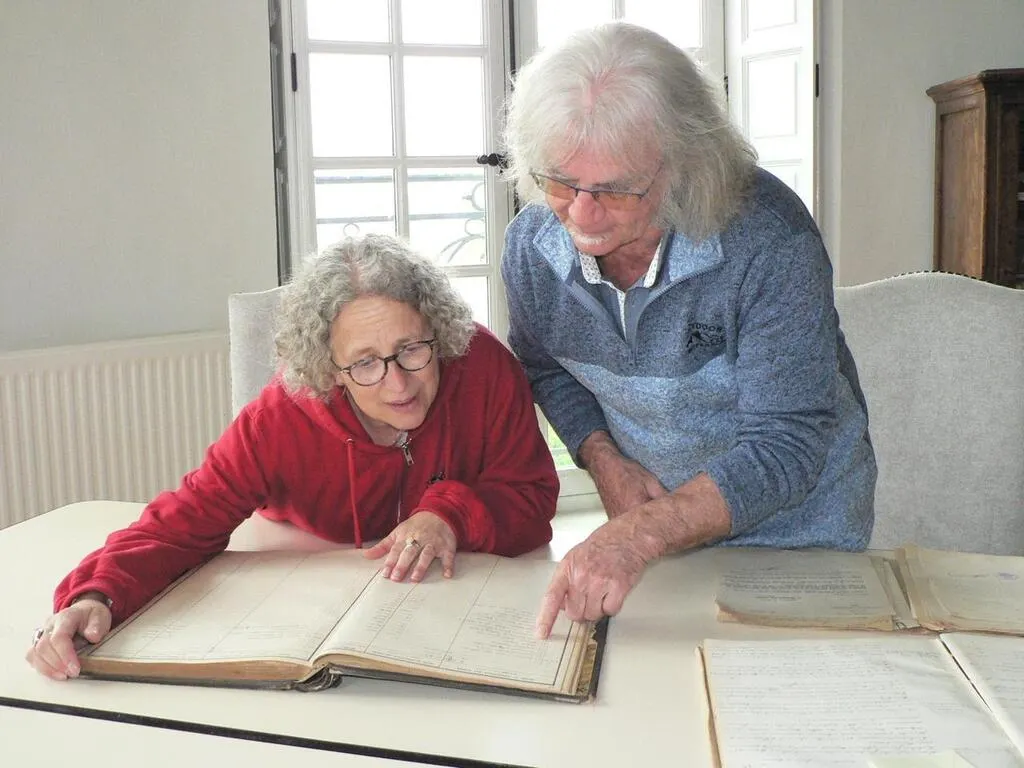 Lea Duval, maire de Beaumont-sur-Sarthe découvre les précieux documents soigneusement classés par l’historien Gaby Lamberdière. © Ouest-France