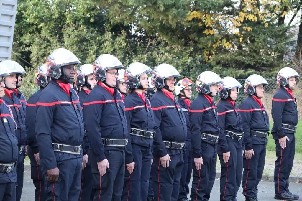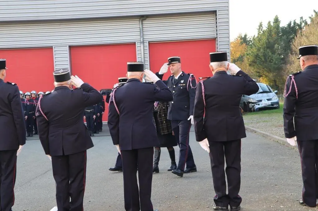 Le lieutenant Stevenn Curran (tout à droite) était à la manÅ“uvre pour cette cérémonie de la Sainte-Barbe du centre de secours et d’intervention de Sablé-sur-Sarthe, samedi 30 novembre 2024. © Ouest-France