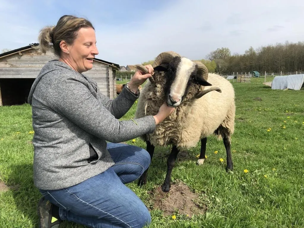 Anne-Sophie Defressine, aux prises avec un bélier qui n’apprécie pas les photographes dans son enclos ! © Ouest-France