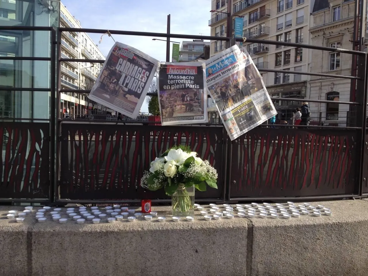 Spontanément, au matin, un Manceau accroche près du parking de la place de la République, les unes de trois journaux, Le Maine Libre, Libération et Aujourd’hui en France. Dans les jours qui suivent, des fleurs et des centaines de bougies y seront également déposées.