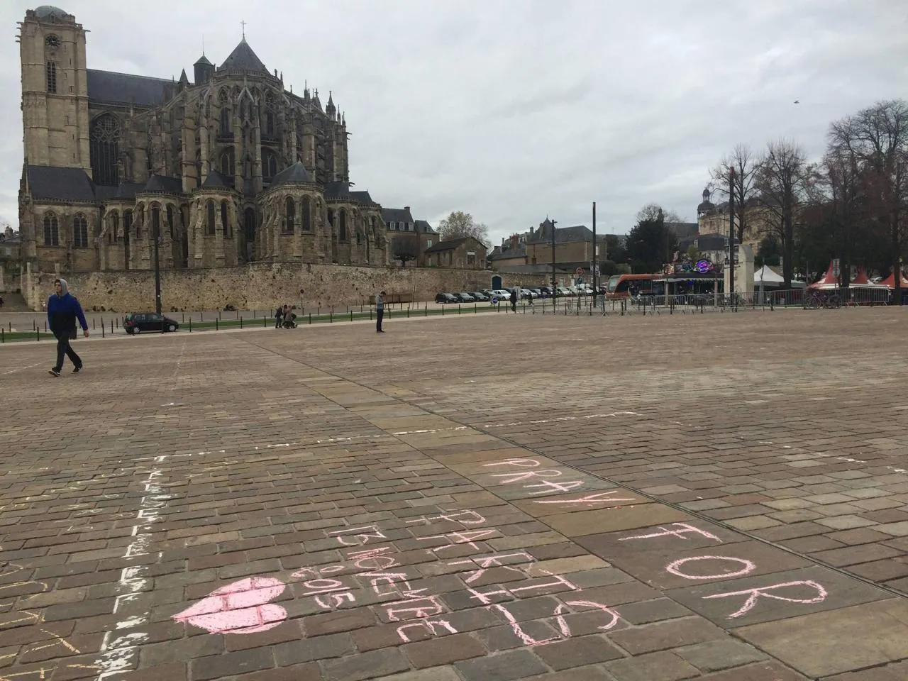Place des Jacobins, des messages colorés ont été inscrits à la craie. Photo archives Le Maine Libre