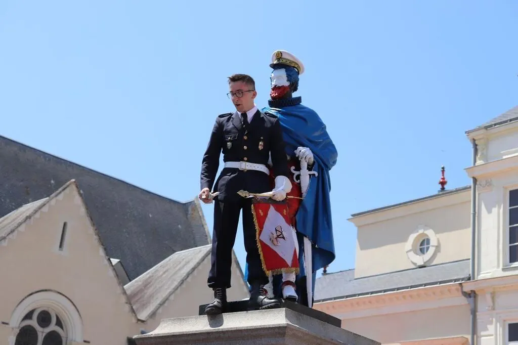 Antonin Carrière, Prix d’honneur 2023, est monté sur la statue d’Henri-IV. Il lui a enfilé la casquette de l’amiral Stanislas Gourlez de la Motte. Les deux hommes ont procédé à l’échange (temporaire) de leurs couvre-chefs lors de la remise du prix. Ouest-France