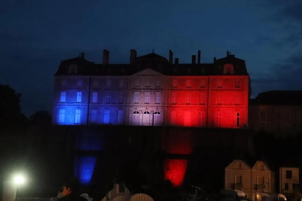 Le château de Sablé-sur-Sarthe, illuminé par le drapeau français avant le feu d’artifice. Ouest-France
