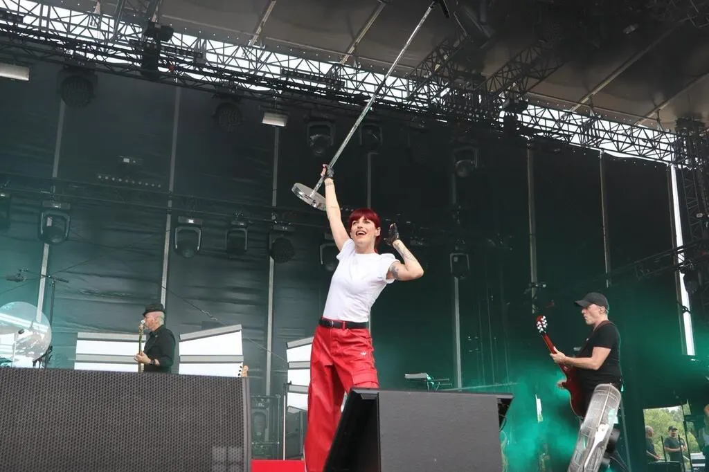 Première grosse affiche de la septième édition du festival À Tout Bout d’Champ, Superbus (ici sa chanteuse Jennifer Ayache) a enchanté le public. Il retrouvait un groupe qui a sorti un tout nouvel album au début du mois de juillet 2025. © Ouest-France