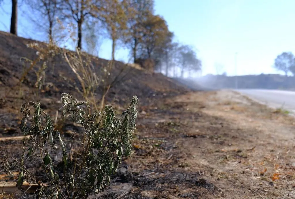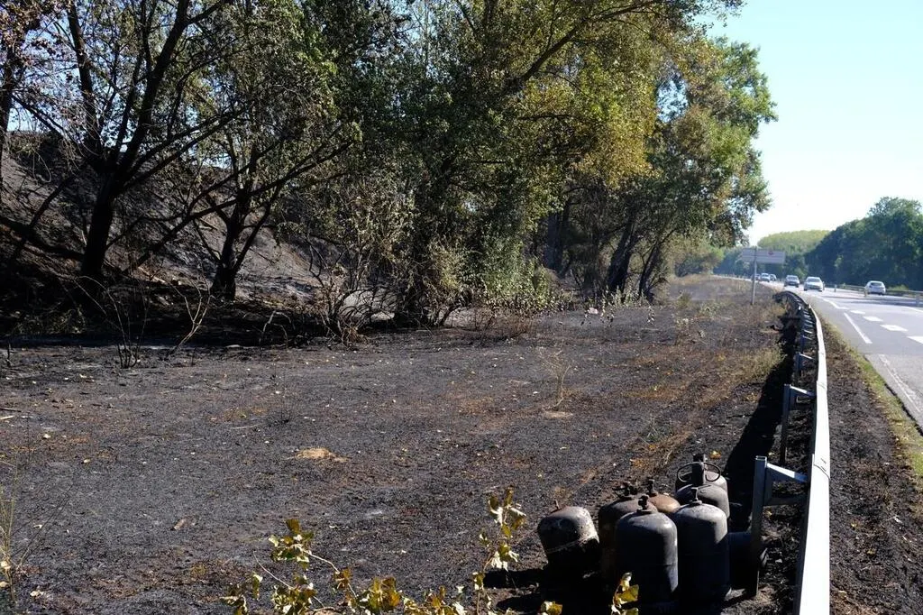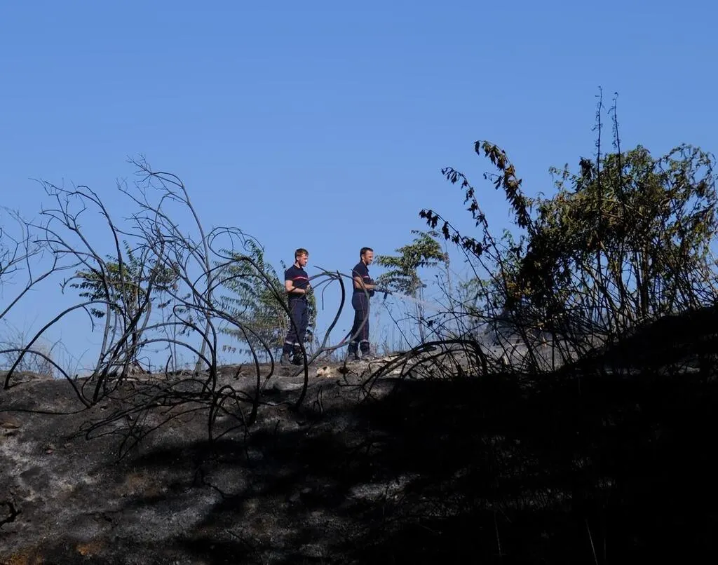 Un paysage de cendres a remplacé la pelouse jaunie de la prairie de Mauves. Les arbres ont laissé place à des troncs noircis. Depuis la route, les automobilistes ralentissent devant le spectacle de désolation. L’odeur de brûlé est persistante et de la fumée continue de s’échapper par endroits.