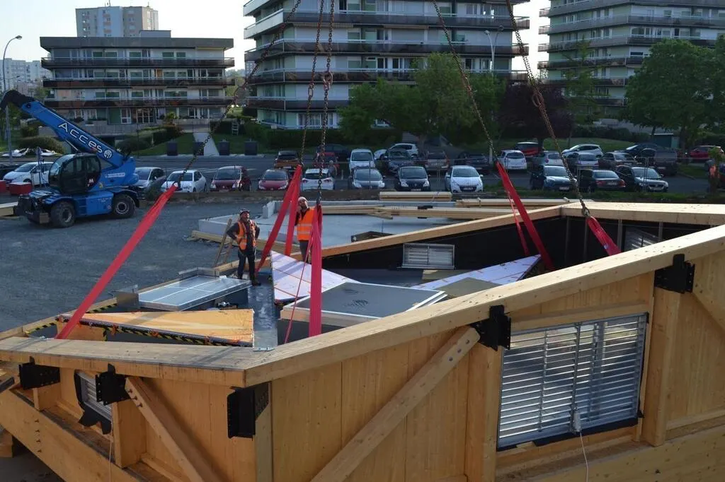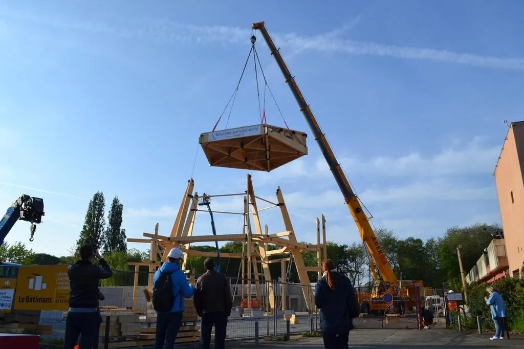 Dès 8 h, les ouvriers se sont affairés pour la délicate opération, qui a duré une bonne heure. À l’aide d’une grue de levage, il a fallu hisser « à 20 mètres de hauteur, la structure de 17 tonnes et d’environ 12 mètres de diamètre », précise Laurie Bouzom, collaboratrice de l’architecte Christophe Theilmann. Un beau bébé, qui a, au préalable, demandé une semaine de montage au sol et deux semaines pendant lesquelles sont intervenus un étancheur et un menuisier.