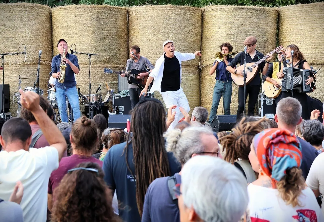 Le chanteur HK et son groupe de musiciens Les Saltimbanks ont mis le feu avec leur « bal paysan » en clôture du Posti’Trucs, dimanche en fin d’après-midi, à Courtillers. © Ouest-France