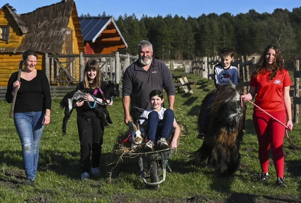 Oizé, mercredi 15 février 2023. Devant les gîtes, Anne-Sophie et Christophe Defressine, avec deux jeunes bénévoles, Lola et Timéo, deux de leurs quatre enfants, Arthur et Justine et une toute petite partie des 100 animaux présents sur les 14 hectares de la ferme. © Le Maine Libre – Denis LAMBERT