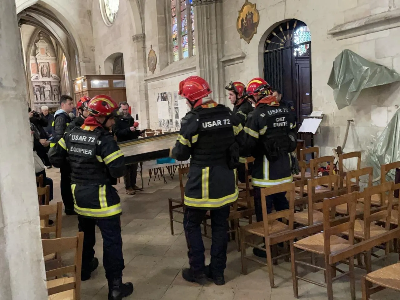 Mercredi 19 novembre 2025. Un exercice simulant un incendie à l’église Notre-Dame-des-Marais a mobilisé une trentaine de pompiers. © Le Maine Libre