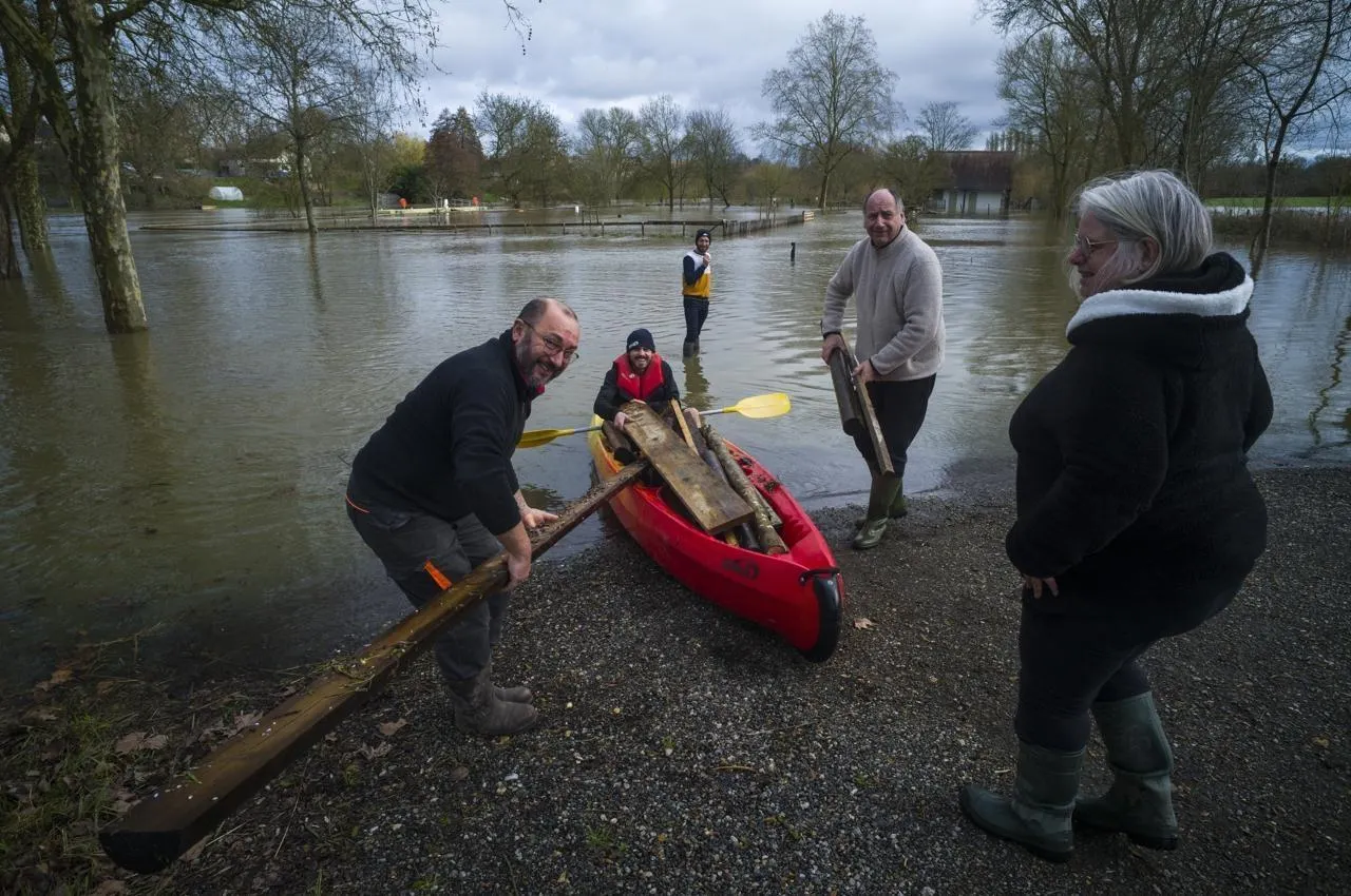 À Roézé-sur-Sarthe, ce samedi 21 février, à la base nautique, ces adhérents récupèrent à l’aide d’un kayak les planches d’un ponton disloqué par la montée de la Sarthe. © Denis Lambert - Le Maine Libre