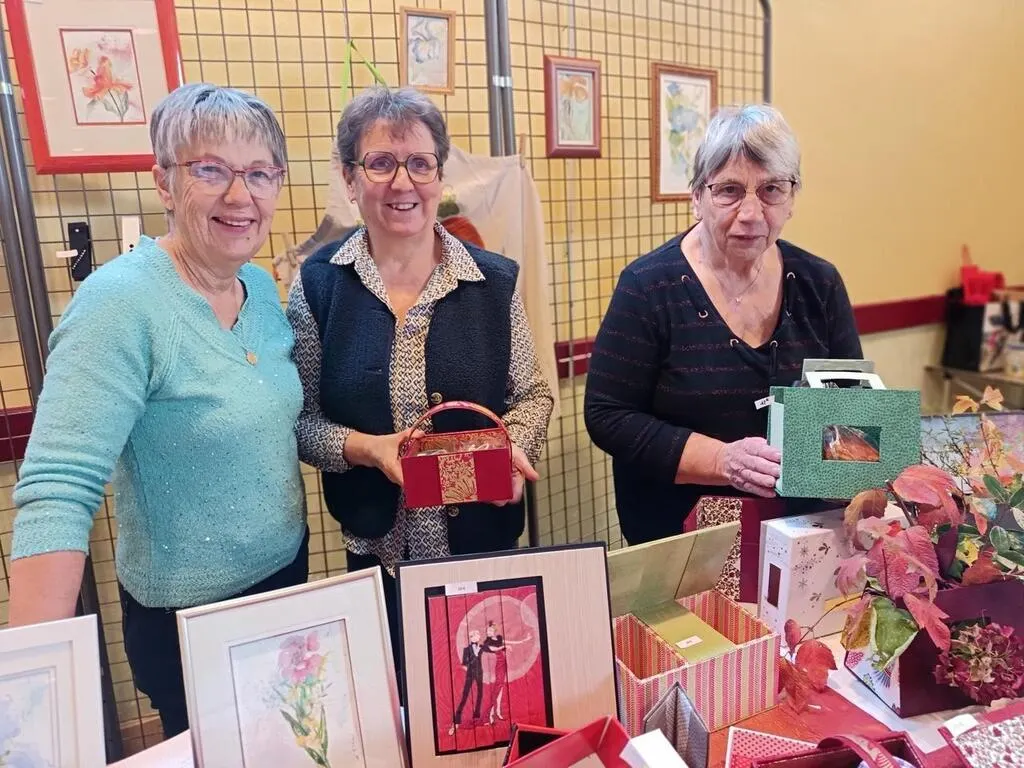 Monique, Hélène, et Nelly, de l’association peinture et loisirs créatifs, avec leurs créations en vente, dont les bénéfices seront reversés à l’AFM Téléthon. © Ouest-France