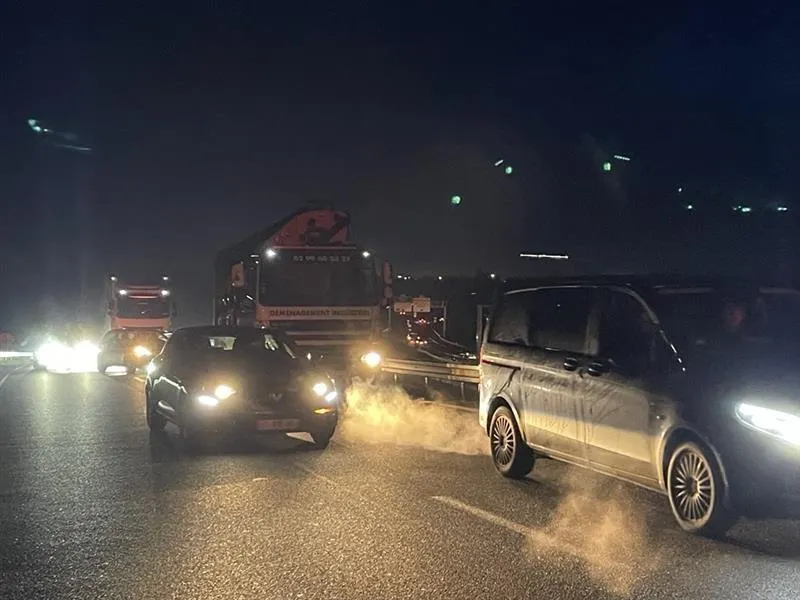A l’appel de la Confédération paysanne, des agriculteurs s’installent aux abords de l’autoroute A11, à Beaucouzé, en Maine-et-Loire. Ils entendent tenir, durant une bonne partie de cette journée du 23 décembre, une action de distribution de tracts pour dire leur opposition à la politique sanitaire de lutte contre la propagation de la dermatose nodulaire bovine. Les premiers ralentissements se font sentir.