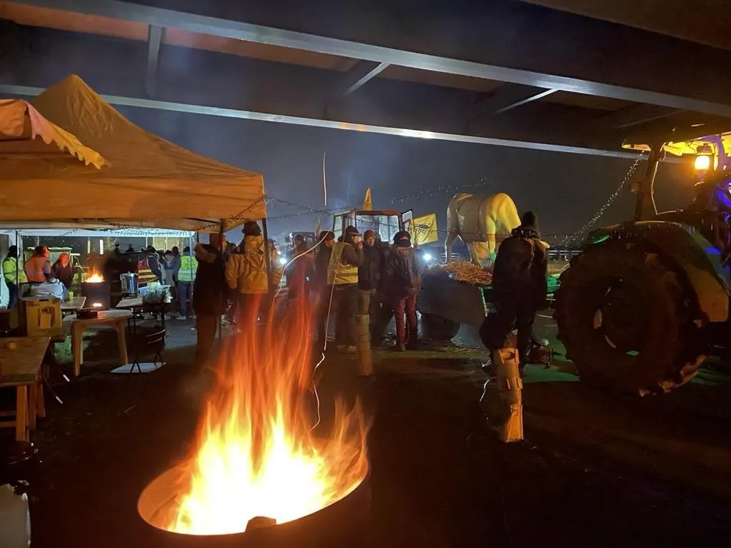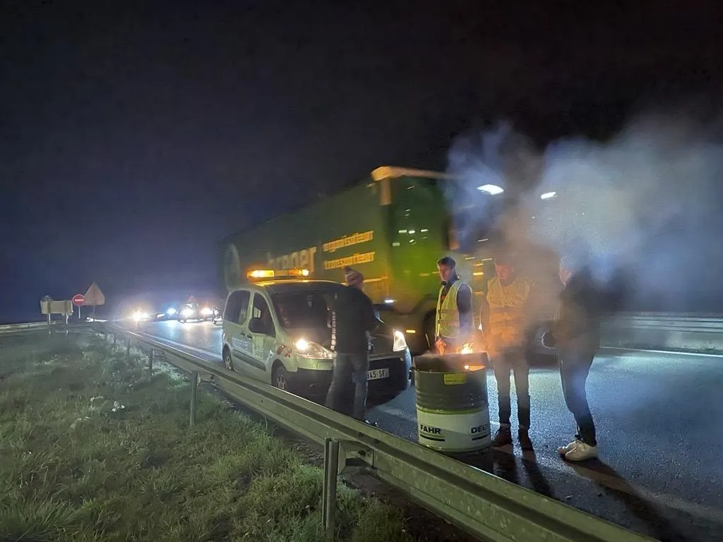 Pour lutter contre le froid, les premiers braséros sont allumés par les agriculteurs mobilisés aux abords de l'A11 près d'Angers, en Maine-et-Loire. OUEST-FRANCE