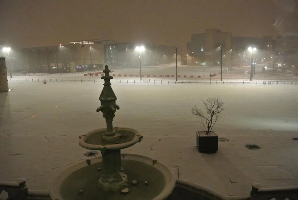 Mardi soir, la place du jet d’eau était quasi immaculée de neige. Ouest-France