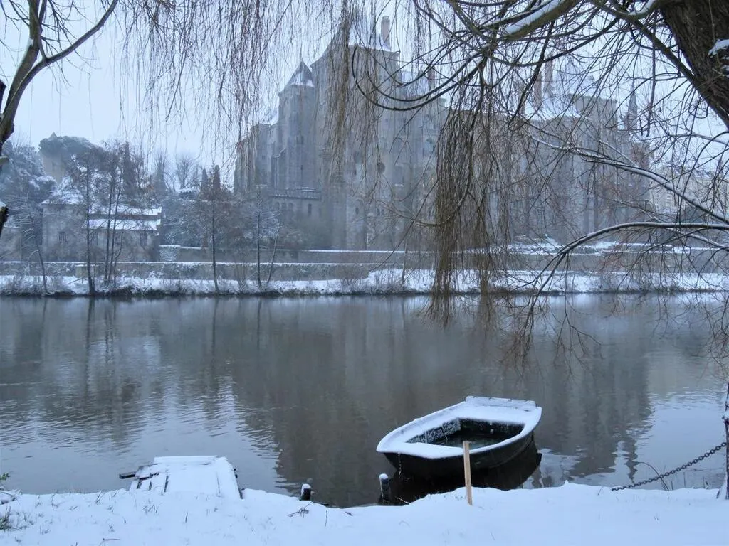 À Sablé-sur-Sarthe, bateaux et château enneigés donnent un décor féérique.