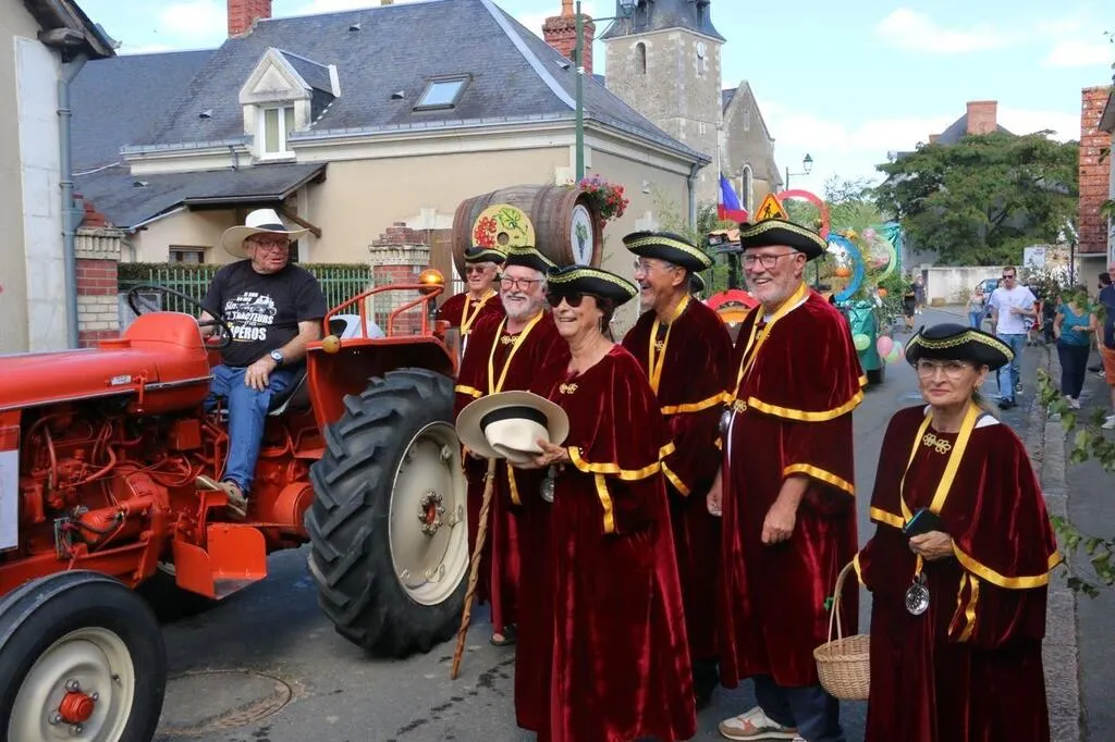 Les membres de l’association des vignobles des coteaux fléchois ont enfilé leur plus belle tunique pour accompagner leur char, dimanche 25 août 2024, à l’occasion du comice agricole. © Ouest-France