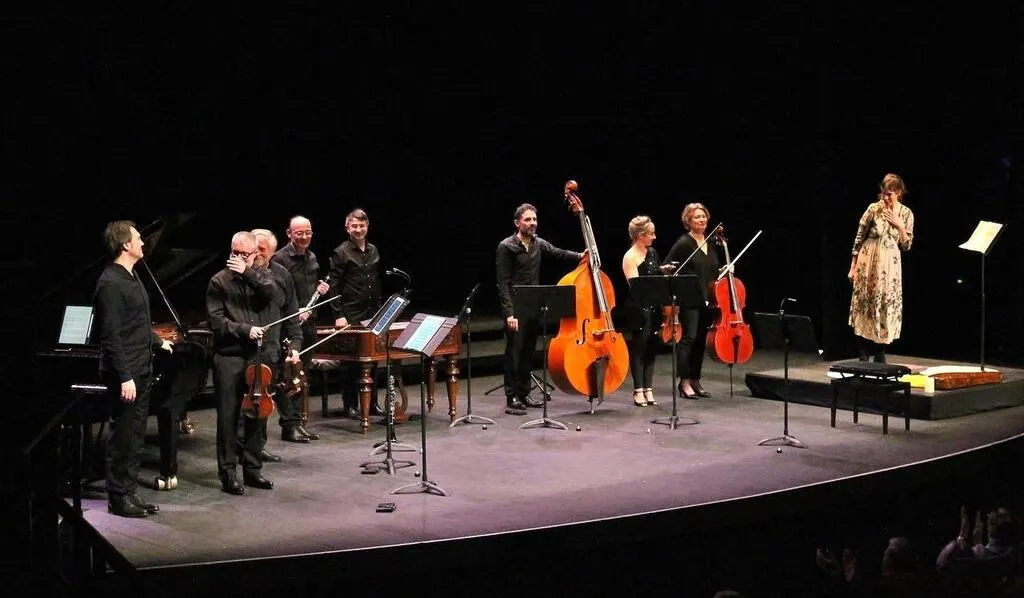 La récitante Élodie Fondacci (à droite) et les musiciens de l’ensemble de musique klezmer Sirba Octet ont été très applaudis pour leur prestation sur « Le Violon magique », samedi soir, sur la scène Joël-Le Theule. Ouest-France