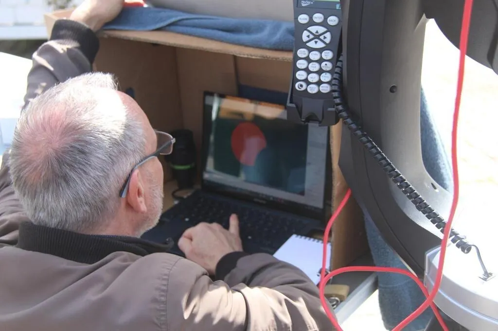 Ce samedi 29 mars 2025, Pascal Fournié, président de l’association Fous de nature à La Flèche (Sarthe), a proposé une observation gratuite de l’éclipse solaire partielle, devant la mairie. © Ouest-France