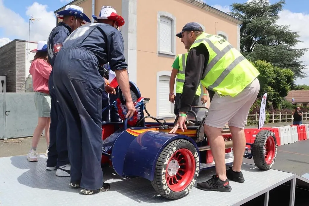Les Jeux olympiques de Paris n’ont pas encore démarré, et pourtant… Une trentaine d’équipages ont pris le départ, ce samedi 13 juillet, de la deuxième édition de la course des caisses à savon à Loué (Sarthe), organisée par l’association Ça roule ma poule. De très nombreux spectateurs se sont agglutinés le long des barrières de la rue des États-Unis pour encourager les valeureux pilotes. L’objectif de la course n’est autre que de dévaler une pente de 650 mètres de long et de 6 % de dénivelé le plus vite possible, à l’aide d’un véhicule sans moteur.
