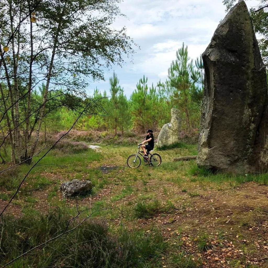 Un jeune homme en BMX au milieu des mégalithes de la Lande des Soucis, à Saint-Jean-de-la-Motte. Julie André/@sojubylo