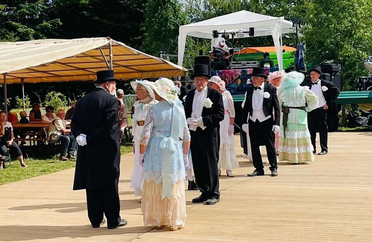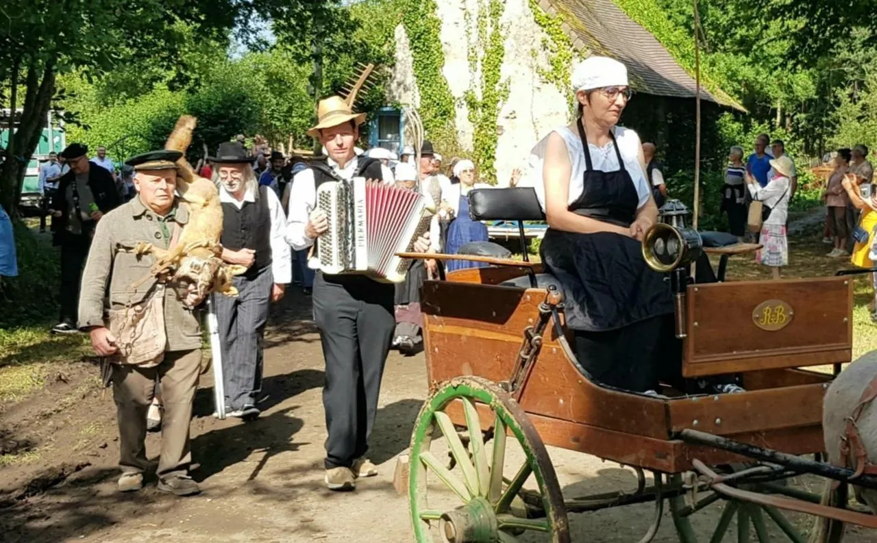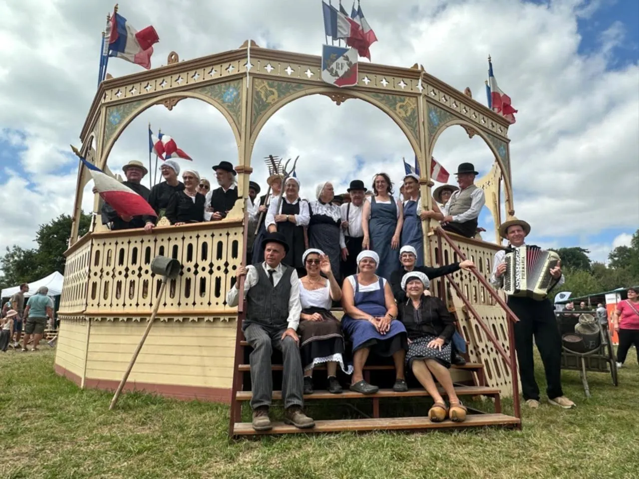 Les villageois en costumes d’époque posent fièrement dans le kiosque historique de Bonnétable, prêté pour l’occasion, symbole vivant du patrimoine rural. © Le Maine Libre