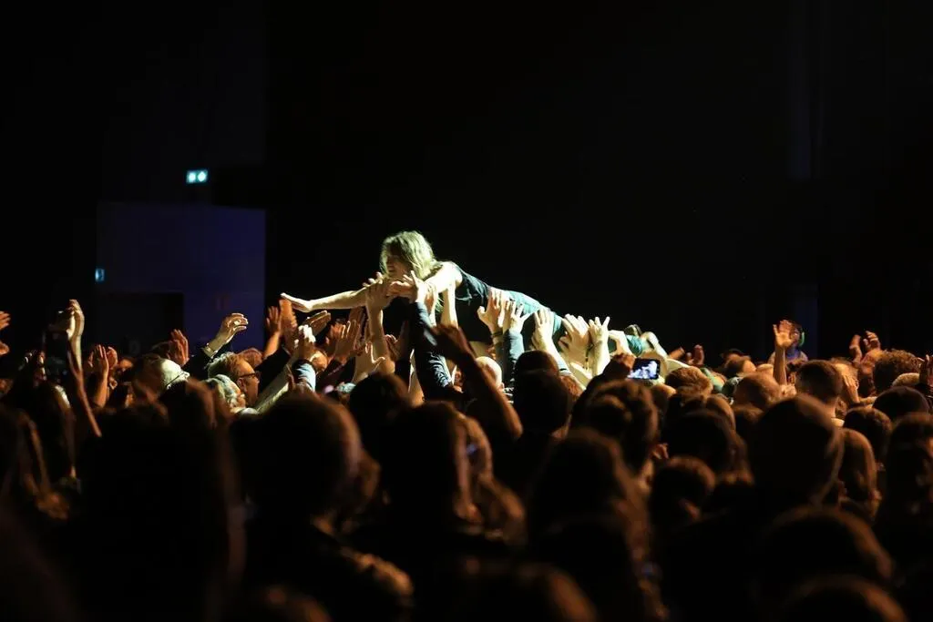 En fin de concert, une spectatrice a partagé la scène avec le groupe et fut invitée à nager sur le public… Sacré souvenir pour elle ! Ouest-France