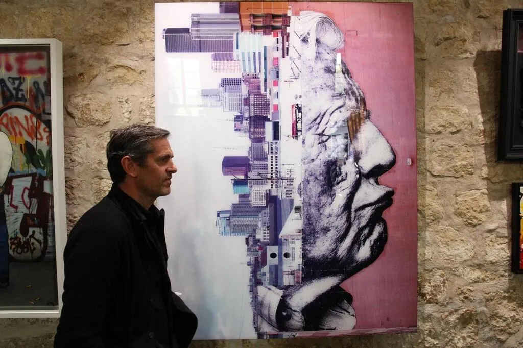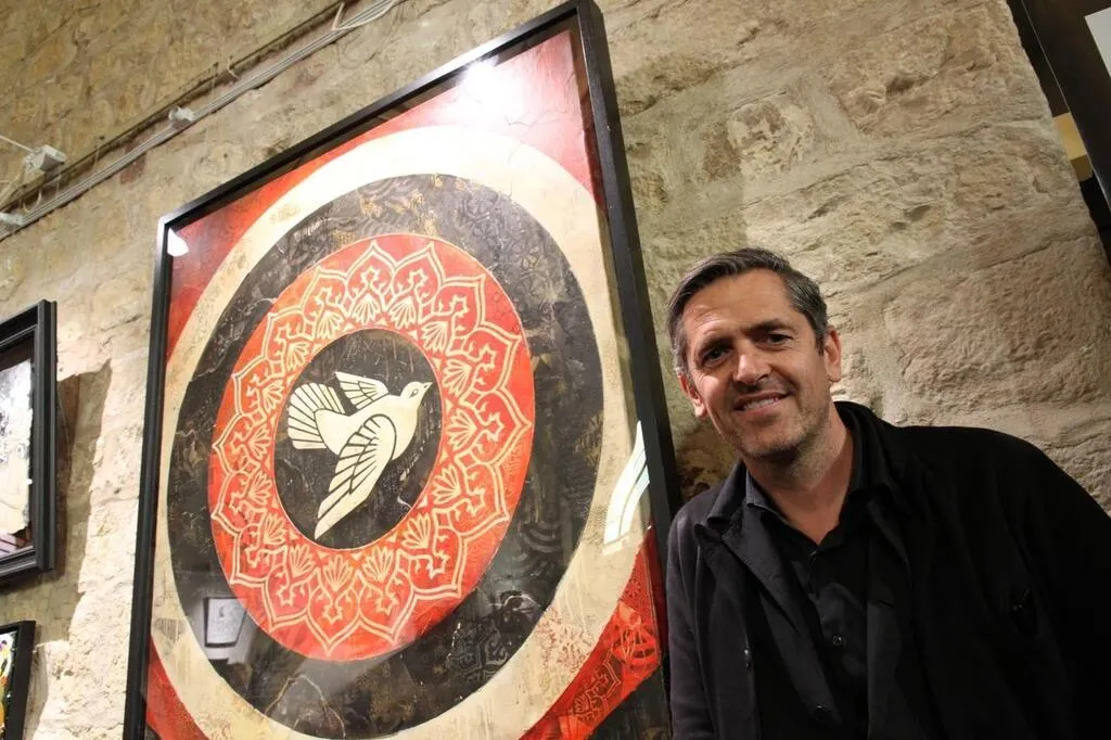 Nicolas Laugero Lasserre à côté de l’œuvre « Dove » de Sheperd Fairey. © Le Maine Libre