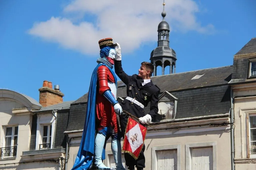 C’est devant une foule très dense que Marin Bouchard, Prix d’honneur 2025 du Prytanée national militaire de La Flèche (Sarthe), a coiffé la statue d’Henri-IV du képi du général, avant de tenir son discours sur la place, ce samedi 28 juin 2025. © Ouest-France