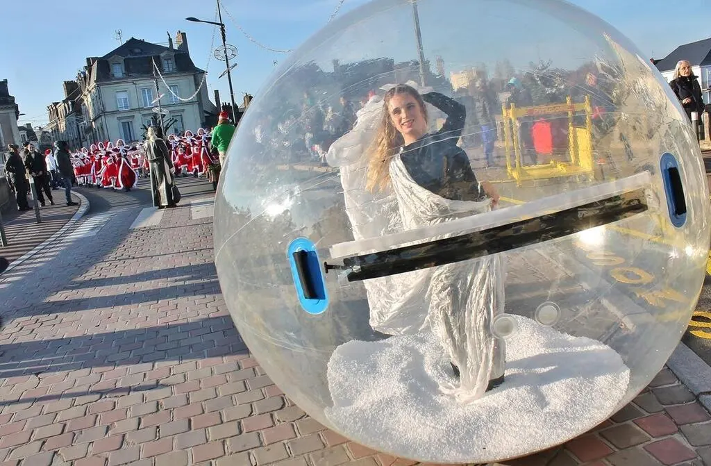 Une drôle de bulle habitée a ouvert la route aux ballets de Sablé danse mania et du Père Noël, samedi. Ouest-France