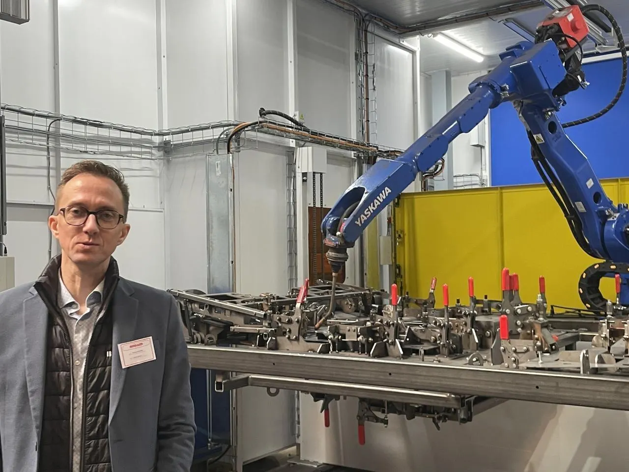 Nicolas Roussel, directeur de Buisard, devant l’un des trois robots de la nouvelle ligne de soudure. © Le Maine Libre